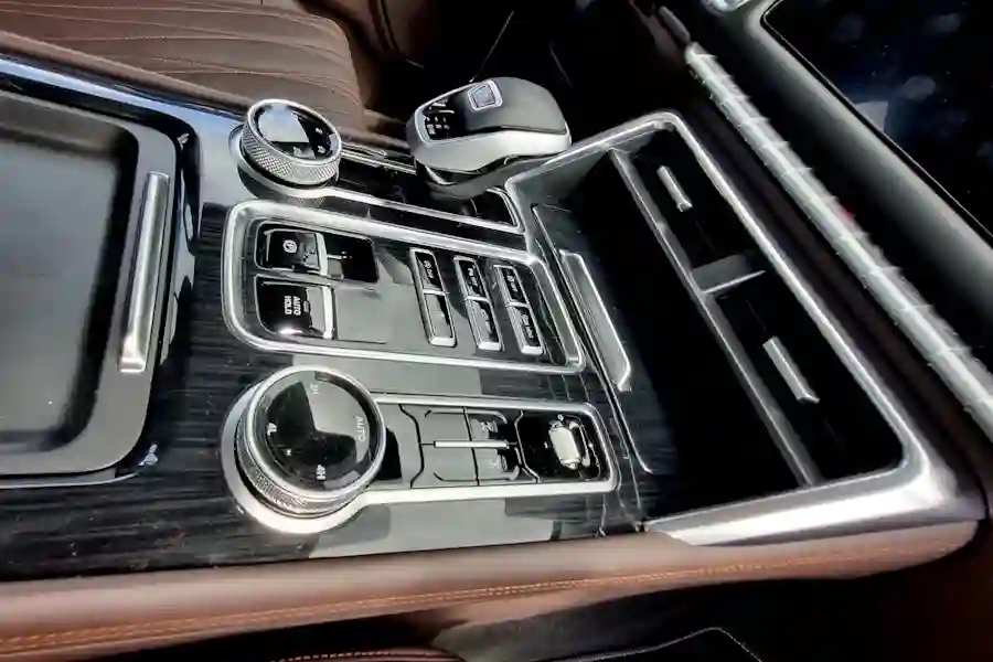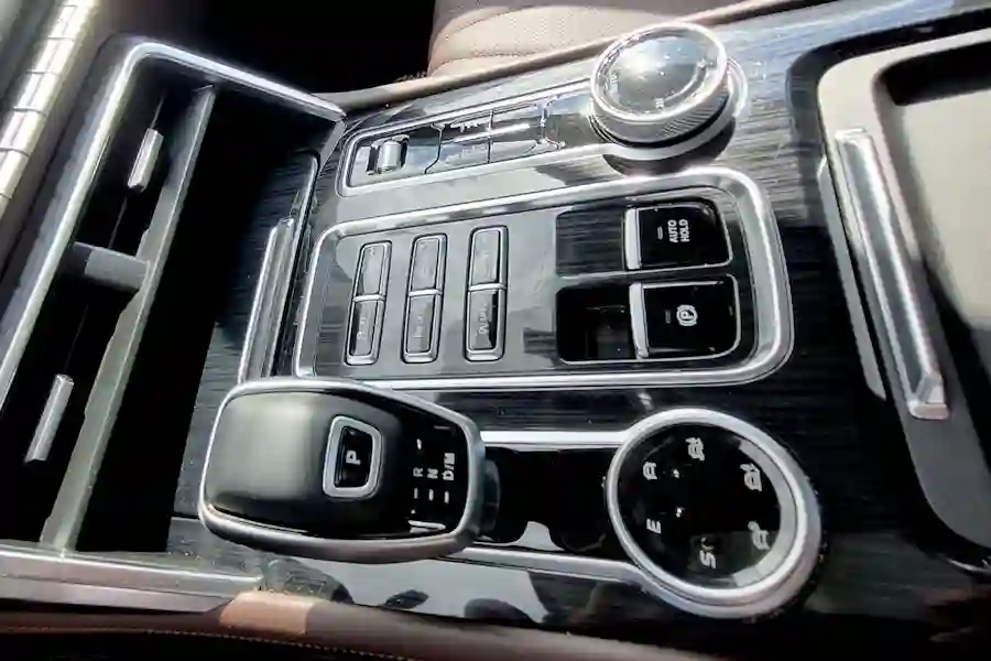 Полноприводная трансмиссия TUNLAND V7 заслуживает отдельного разговора. Полный привод Borg Warner с раздаточной коробкой передач предлагает не только жестко зафиксированные режимы заднего, полного и полного привода с понижающим рядом, но и автоматический режим работы 4х4, когда передний мост включается в работу сам при пробуксовке задних колес. Под правой рукой водителя есть не только шайба переключения режимов 2H, 4H, 4L и AUTO, но и вторая шайба где можно выбрать режимы снег, песок, спорт и другие варианты настройки работы трансмиссии.