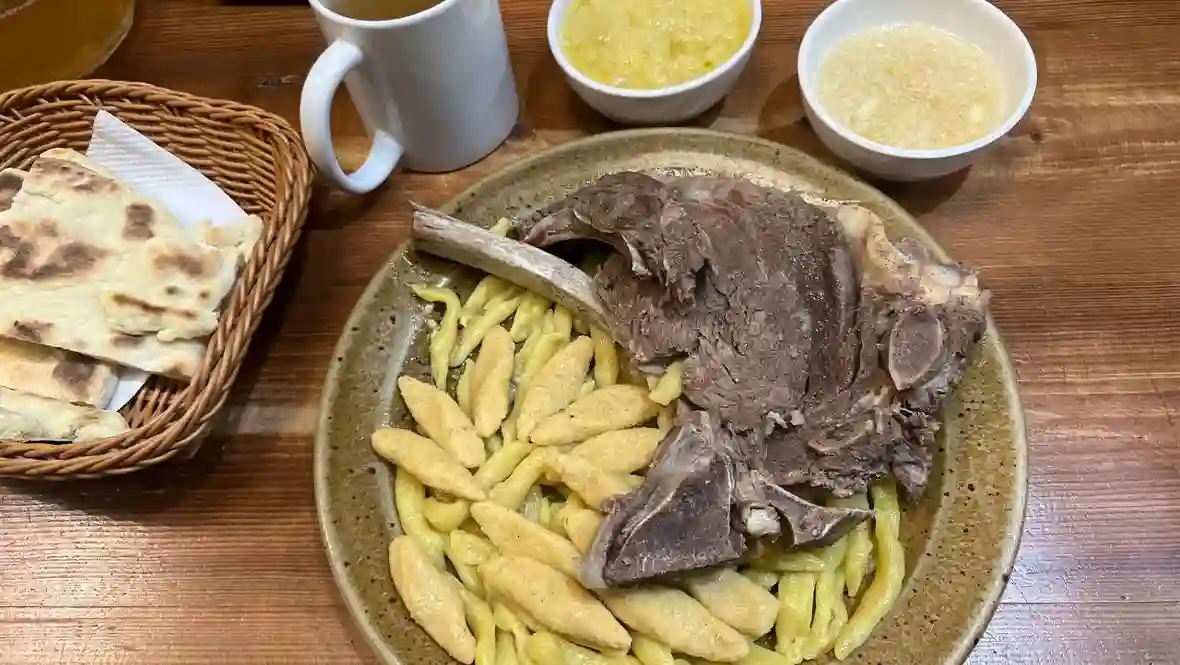 На ужин отправились в ресторан с национальной кухней — «Жижиг-Галнаш». Не могу передать словами, насколько это было вкусно. Порции огромные — ел даже тогда, когда уже не мог.
