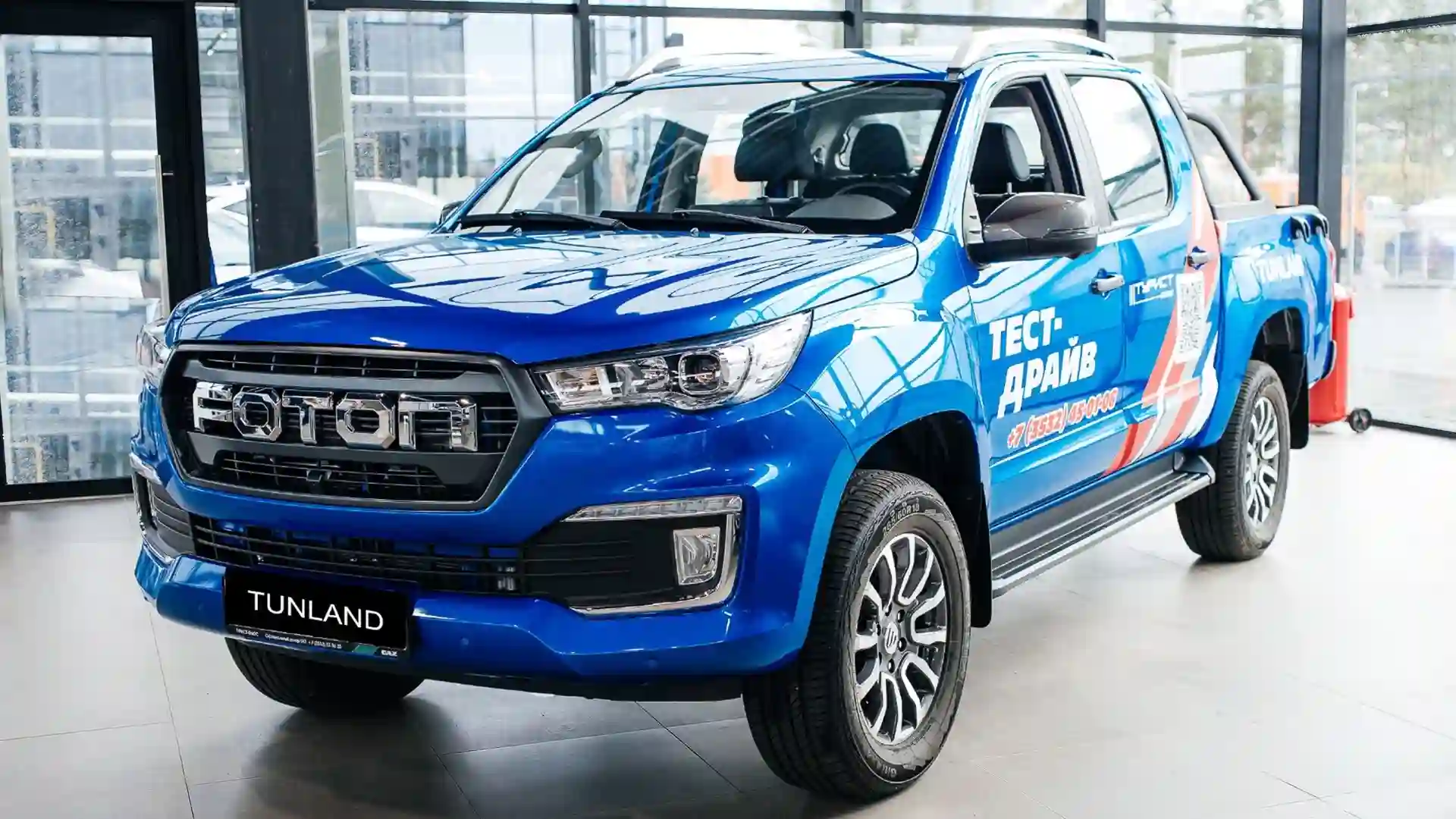 Высокую оценку со стороны специалистов получила премиальная модель FOTON TUNLAND V9 — полноразмерный пикап со стильным дизайном и расширенным набором систем безопасности. Габариты модели — 5617 × 2090 × 1955 мм, колесная база — 3355 мм, дорожный просвет — 240 мм. Максимальная разрешенная масса составляет 3055 кг, грузоподъемность — 675 кг. Размер грузовой платформы — 1577 × 1650 × 530 мм. Автомобиль оснащен 2-литровым турбодизельным двигателем экологического класса «Евро-5» мощностью 159 л.с., с крутящим моментом 410+60 Н•м в диапазоне 1500–2400 об/мин, работающим в паре с 8-ступенчатой автоматической коробкой передач. В состав силовой установки входит 48-вольтовая гибридная система, добавляющая 60 Н•м, а при пиковых нагрузках — более 80 Н•м, что повышает топливную экономичность и динамику, особенно при разгоне и движении в гору. Система рекуперации энергии снижает расход топлива на 5–8%.