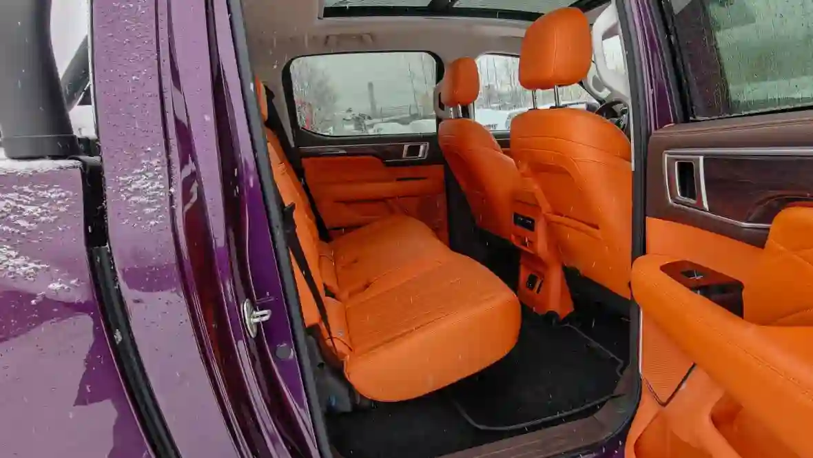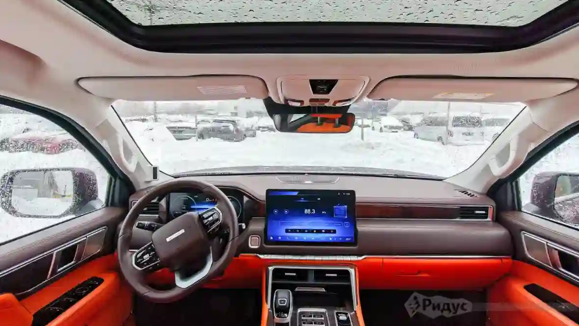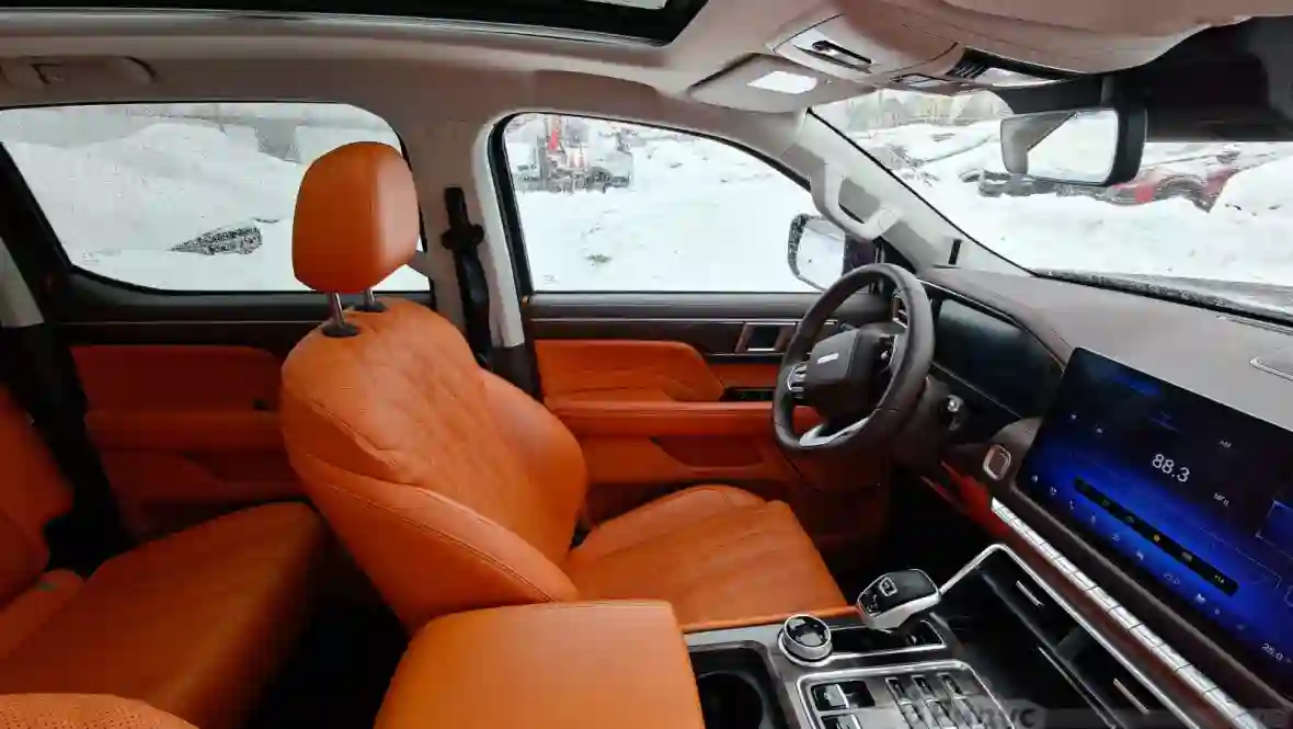 Интерьер FOTON TUNLAND V9 полностью схож с интерьером V7 с тем же самым намеком (не беспочвенным) на премиальность. Правда, в отличии от «строгого коричневого» V7, салон «девятки» выполнен в незабываемом мандариновом цвете. В сочетании с панорамной крышей, это делает салон веселым и жизнерадостным. Единственный минус «мандарина» — повышенная маркость.